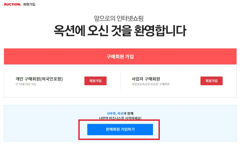 옥션 회원 가입 화면에서 ‘판매회원 가입하기’ 버튼을 눌러 진행합니다.