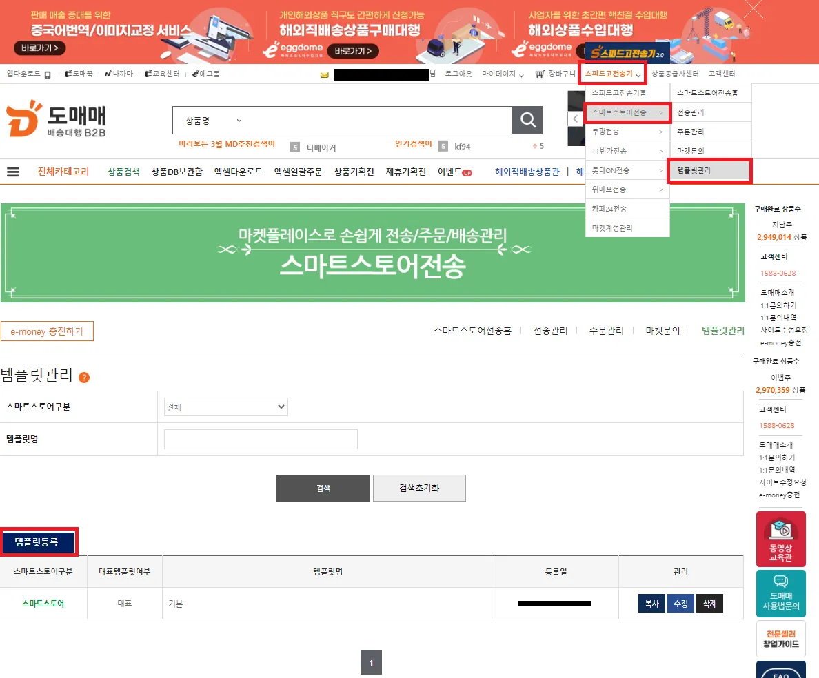우측 상단 > 스피드고전송기 > 스마트스토어전송 > 템플릿관리