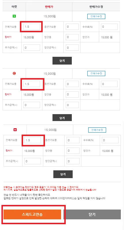 판매가요율 및 기타정보를 확인하고 스피드고전송을 누릅니다.