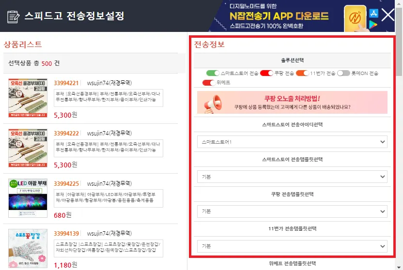 500개 상품을 등록하면서 나타난 오류 내역입니다.