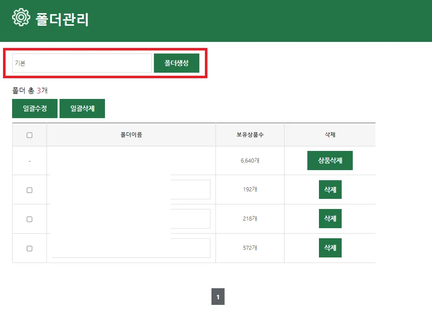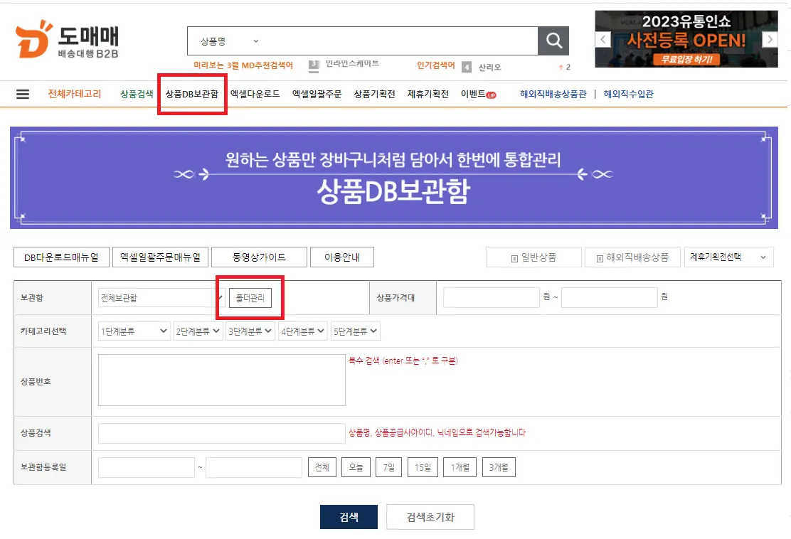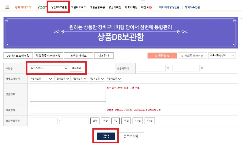 상품DB보관함 메뉴에서 해당 폴더를 선택하고 검색을 누릅니다.