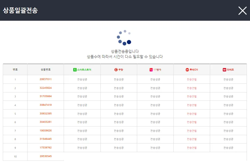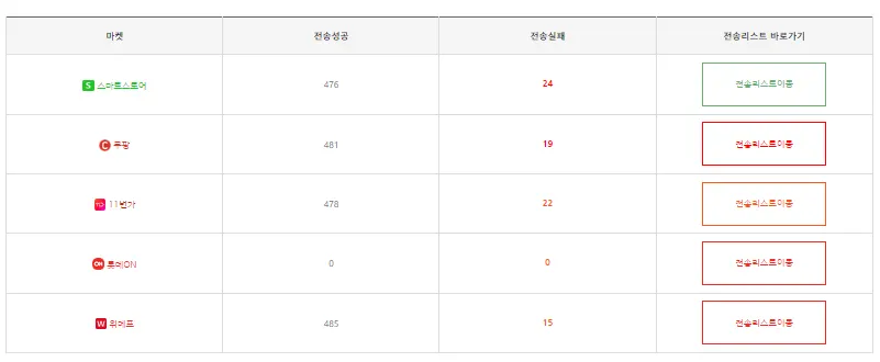 이런 식으로 전송성공이 뜨면 성공입니다.(롯데온은 연동이 안되어 있는 상태입니다.)