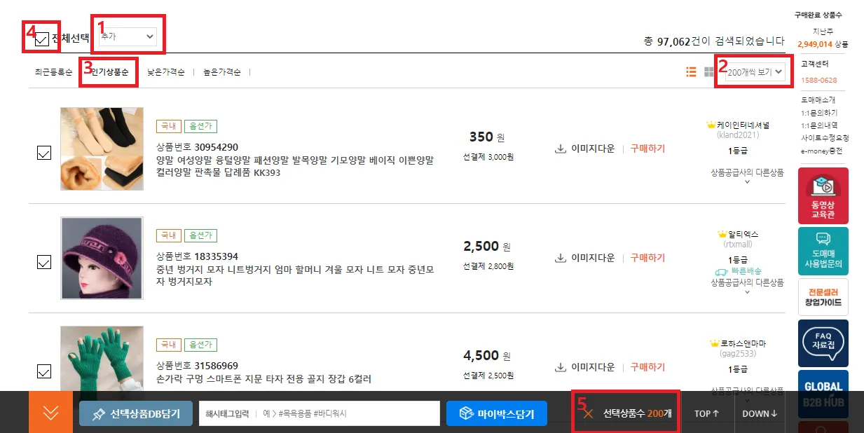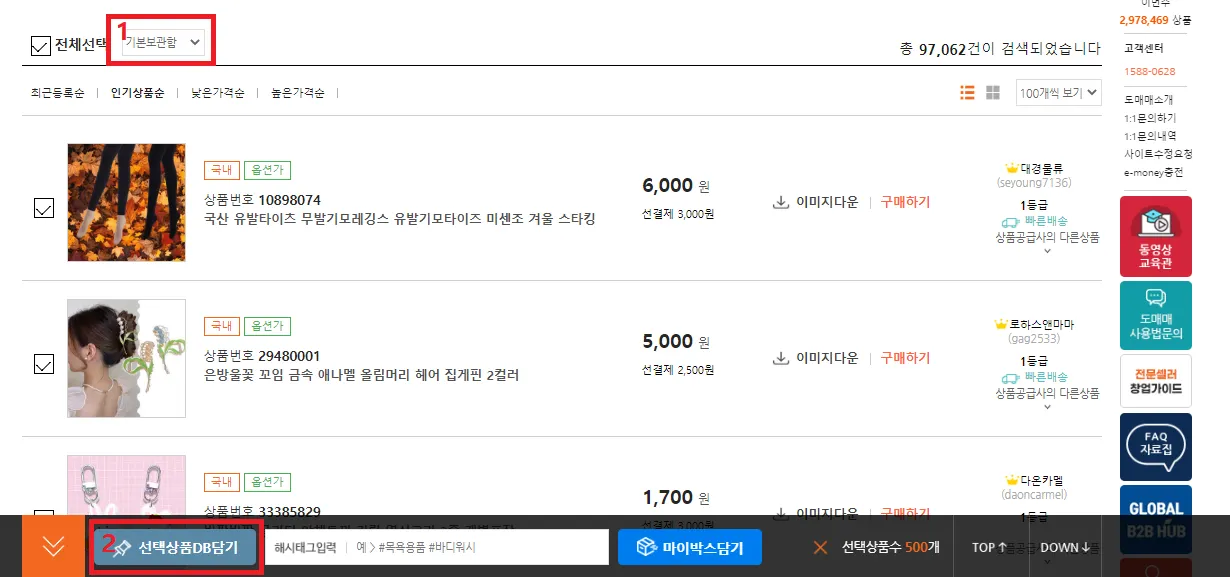 상품을 담기전 DB보관함 폴더를 확인해주시고, 하단 선택상품DB담기를 선택합니다