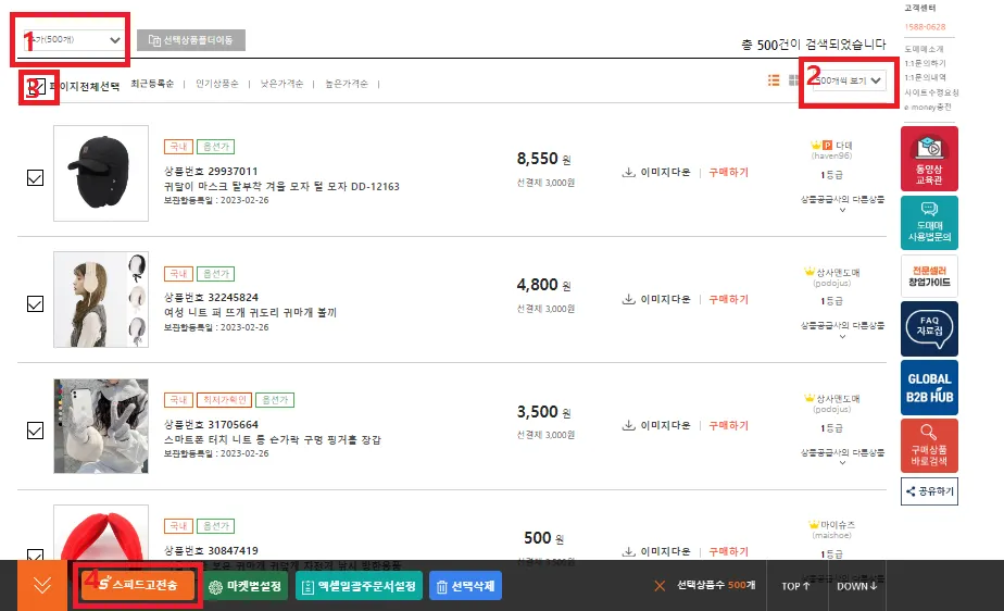 페이지 전체를 선택합니다. 500개가 한 번에 선택되고, 그 이상 선택하신다면 다음 페이지로 가셔서 또 선택하시면 됩니다. 단, 한번에 최대 1,000개까지 전송가능합니다.